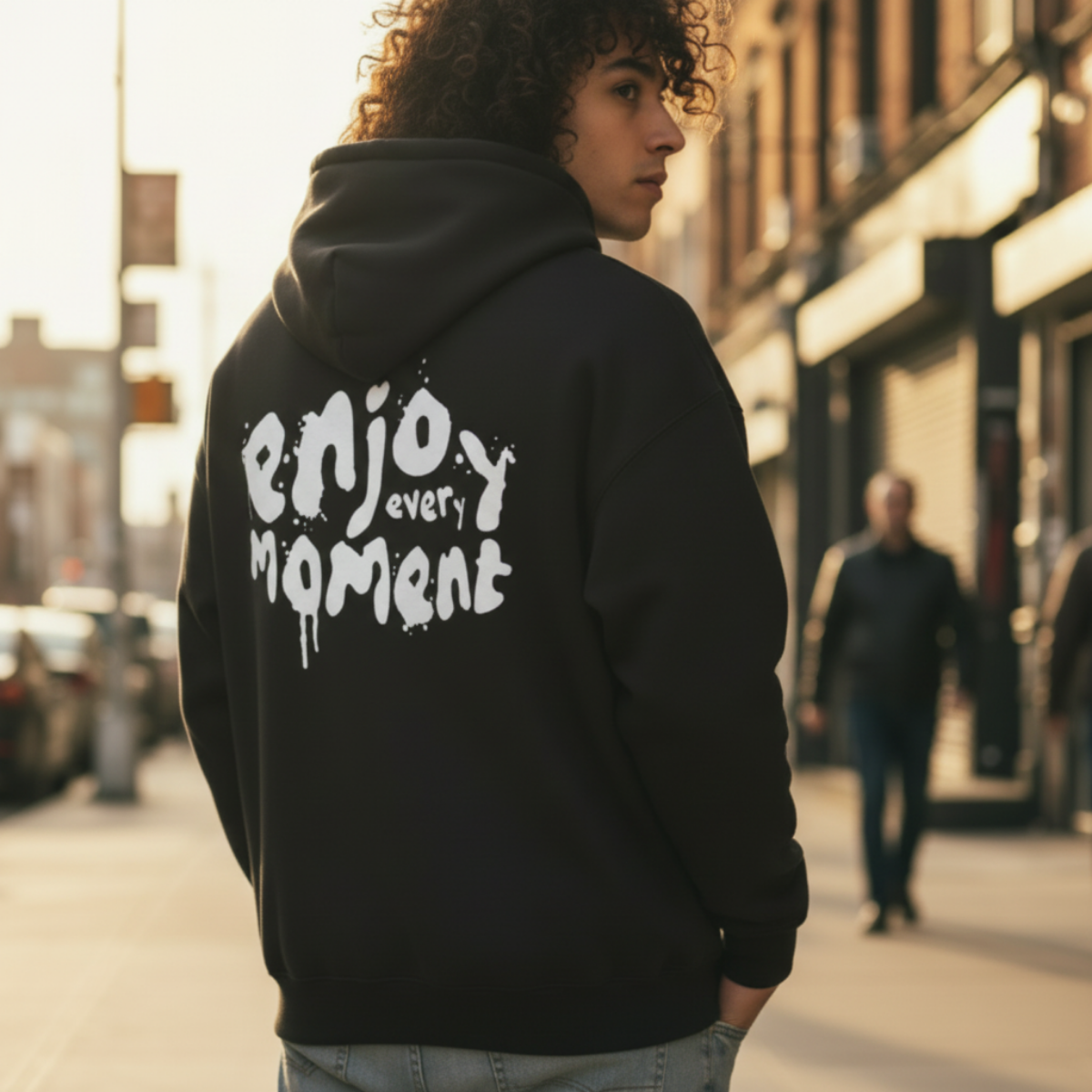 This roomy hoodie feels like a quiet exhale after a long day. Soft, mid-weight fabric and a double-lined hood create a cocoon of warmth while the roomy kangaroo pocket keeps hands cozy and small essentials within reach. A bold, hand-painted style back print reads like a gentle reminder to slow down and savor the little things — an everyday piece that becomes part of your routine, not just another layer. Wear it on slow mornings with coffee, on evening walks through the neighborhood, or when you need a calming anchor during travel. The understated silhouette and neutral color let the message speak without shouting.